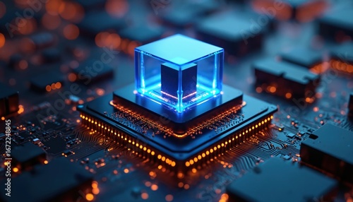 Abstract digital data cube system architecture features glowing blue cube on circuit board. Network, server, processing, information, computing, computer, hardware, software, circuit, motherboard,