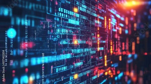 Abstract digital data flow with binary code and glowing lines.