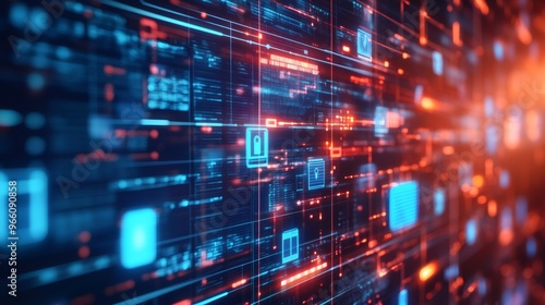 Abstract digital data flow with blue and red glowing lights on a dark background.
