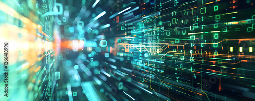 Abstract digital data flow with glowing lines and binary code in a futuristic setting