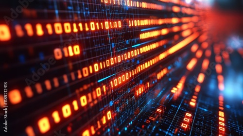 Abstract Digital Data Stream Binary Code glowing orange and blue technological background