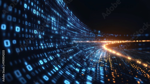 Abstract digital data stream flowing in a curved tunnel.