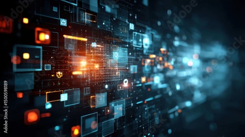 Abstract Digital Data Stream, Futuristic Technology Background with Glowing Orange and Blue Elements