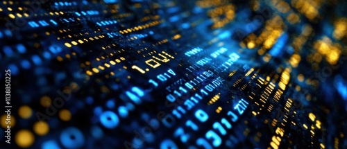 Abstract Digital Data Stream: Glowing Blue and Gold Binary Code Background