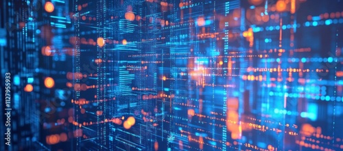 Abstract digital data stream, glowing blue and orange lines and particles.