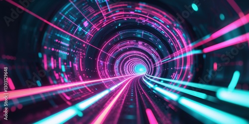 Abstract Digital Data Stream Tunnel with Bright Neon Colors.