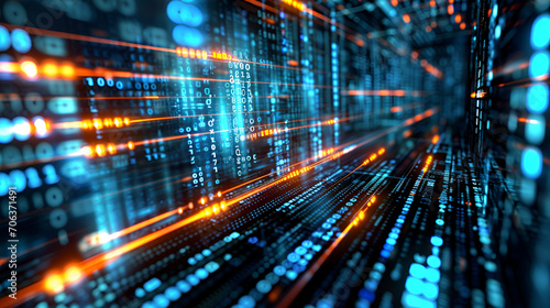 3D illustration of glowing digital binary code flowing through a virtual tunnel, symbolizing data transmission.