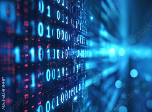 Abstract Digital Data Stream with Binary Code in Blue and Red Colors for Technology and Cybersecurity Background Design