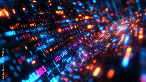 Abstract digital data stream with glowing binary code.