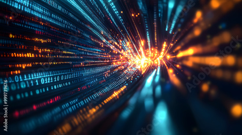 Abstract digital data stream with glowing lines and numbers, representing fast internet connection, technology, data flow, and digital world.