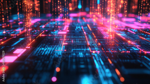 Abstract digital data streams flow across a glowing circuit board network a futuristic technology visualization