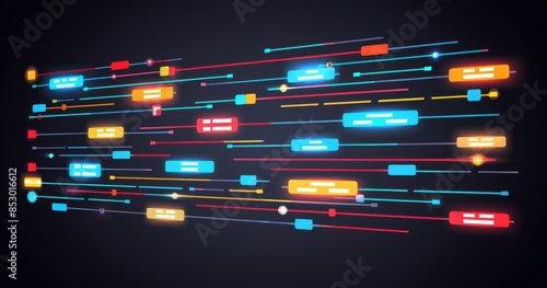Abstract digital data visualization with colorful lines and blocks on a dark background, representing data flow and technology.