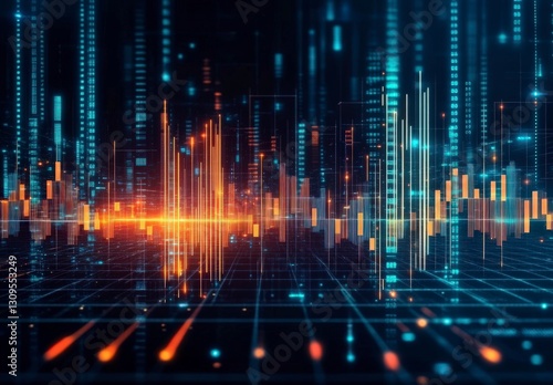 Abstract digital data visualization with glowing bars and lines representing sound waves and analytics in a high-tech environment.