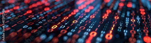 Abstract digital data visualization with red and blue binary code streams, representing technology, data, and programming concepts.