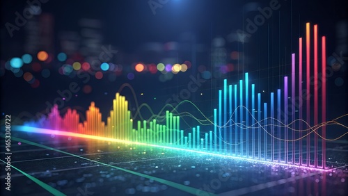 Abstract digital data visualization with vibrant, multicolored light beams forming a futuristic graph or audio equalizer.