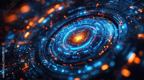 Abstract digital design featuring glowing blue and orange circular patterns.