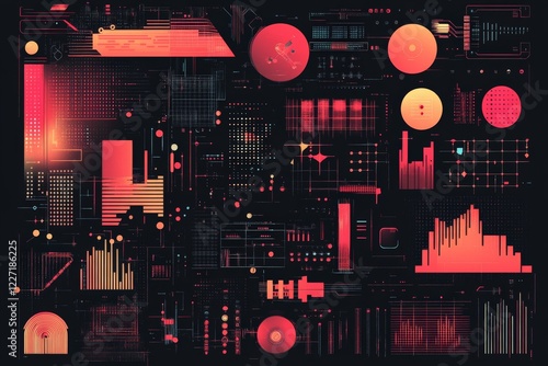 Abstract digital design featuring red and black graphics with data visualization elements and geometric shapes