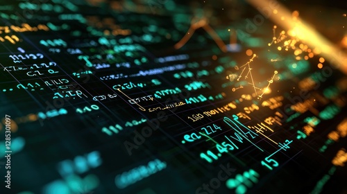 Abstract digital financial data visualization with glowing graphs and numbers on a dark background