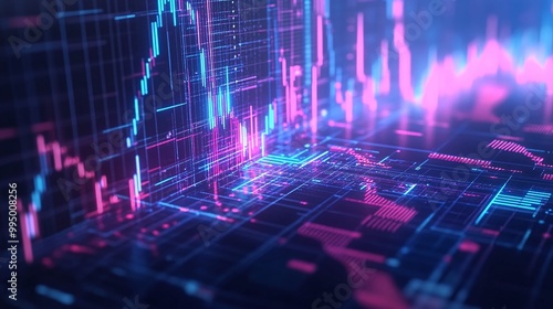 Abstract digital financial data visualization with vibrant colors and dynamic graphs, illustrating stock market trends.
