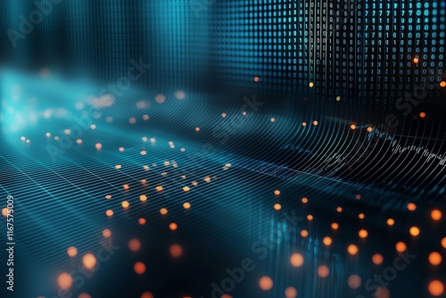 Abstract digital grid with glowing dots and lines, creating a dynamic representation of network data flow in a futuristic, high-tech environment.