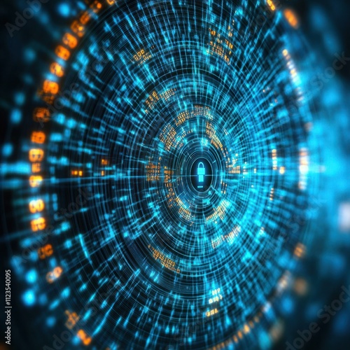 Abstract digital illustration of a secure data network with interconnected lines showcasing encryption symbols and glowing binary code in a circular pattern