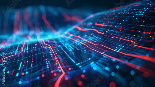 Abstract digital landscape depicting a high-tech circuit board with illuminating data lines