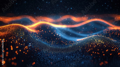 Abstract digital landscape, glowing particles, wavy surface, space background