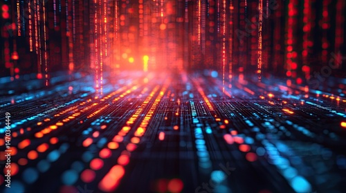 Abstract digital landscape with falling code in red and blue futuristic environment design