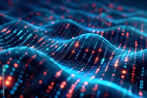 Abstract digital landscape with flowing 3D data and binary code on a futuristic matrix background, visualizing big data and technology concepts.