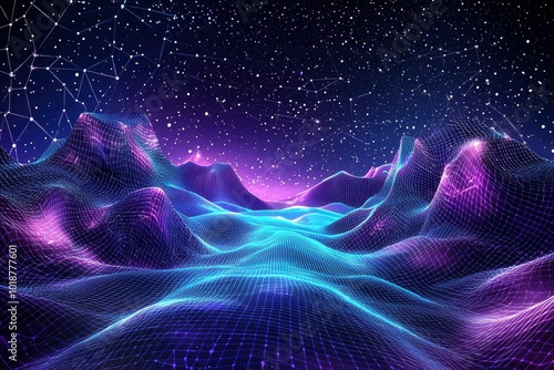Abstract Digital Landscape with Glowing Grid and Stars