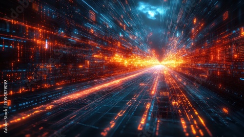 Abstract digital landscape with glowing lines and patterns.