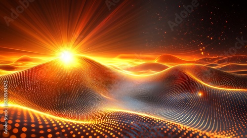 Abstract Digital Landscape with Glowing Particle Waves and Radiant Light Source