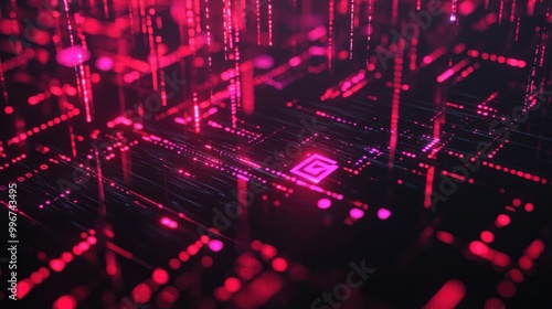 Abstract digital landscape with glowing red data points and lines, representing technology and networks.