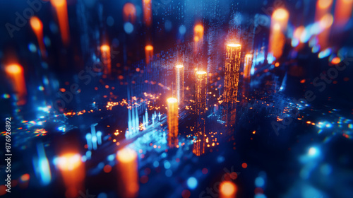 Abstract digital landscape with glowing vertical columns and bright data points, representing a virtual cityscape or data visualization.