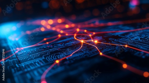 Abstract digital network connection, glowing lines and nodes on circuit board.
