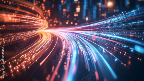 Abstract digital network connection with orange and blue glowing light trails and city background