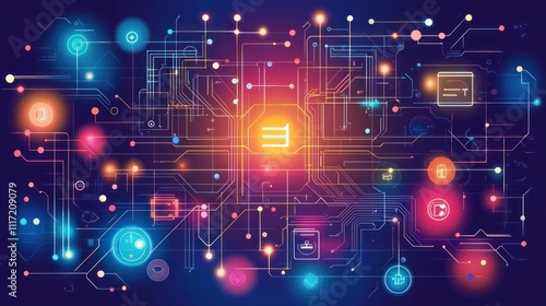 Abstract digital network glowing with colorful nodes and lines.