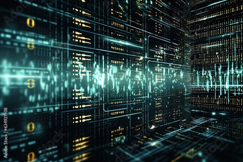 Abstract digital network. Lines of code, web elements, data flow. Represents interconnected cyberspace. Concept of modern computing and internet integration.