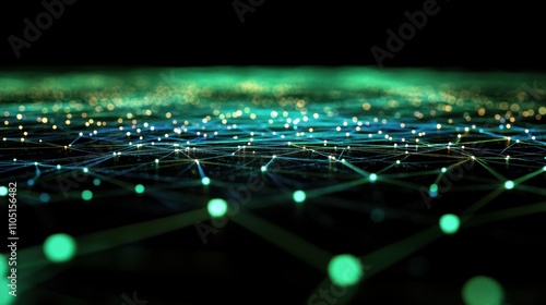 Abstract digital network of glowing lines and dots in green and blue hues on a black background.