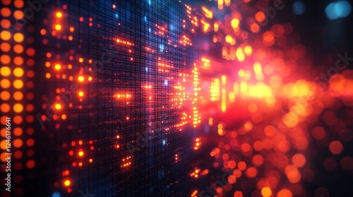Abstract Digital Network Orange Red Glowing Lights Technology Background Data Grid Shiny Bokeh