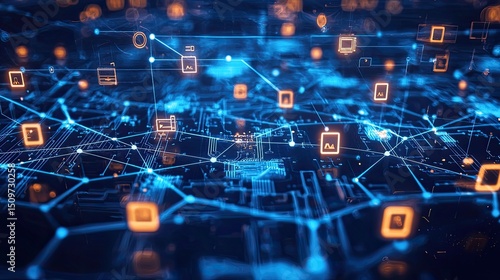Abstract digital network structure with glowing symbols.
