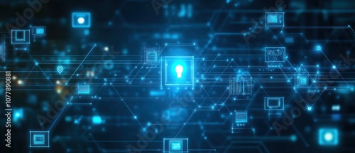 Abstract digital network with a key symbol, representing cybersecurity and data protection.