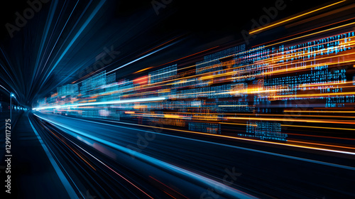 Abstract Digital Network with Blue and Orange Light Trails over Dark Background