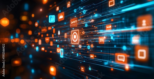 Abstract digital network with glowing icons and data streams in a futuristic setting