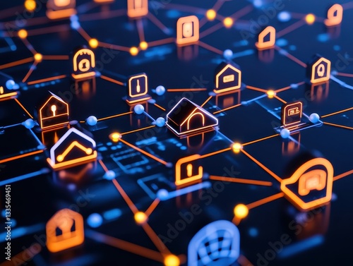 Abstract digital network with glowing icons representing smart home technology