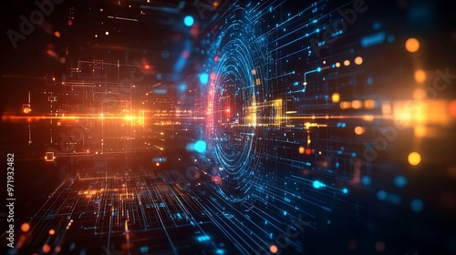Abstract Digital Network with Glowing Lines and Circular Elements