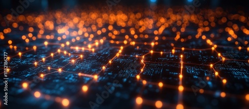 Abstract digital network with orange glowing nodes and blue lines.