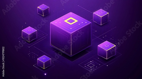 Abstract digital purple cubes with glowing lines and circuits connected on a dark purple background.