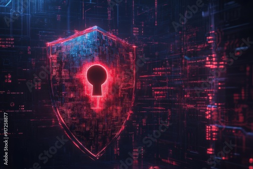 Abstract digital shield with keyhole symbolizing cybersecurity and data protection in a high-tech environment.