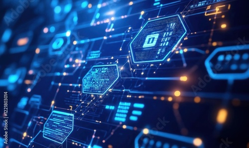 Abstract digital technology background with glowing circuit board and data.